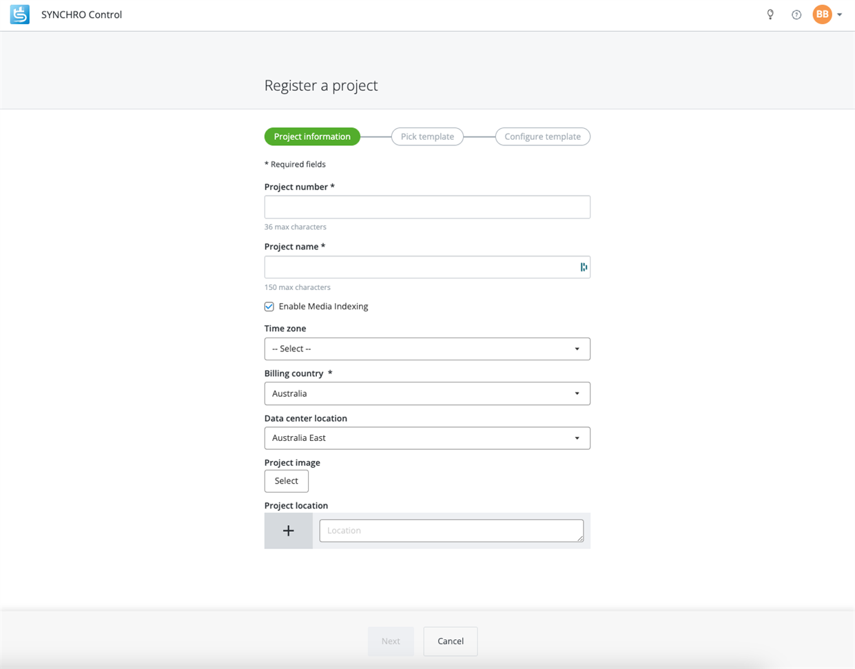 1) Login to SYNCHRO Control via https://construction.bentley.com, You should be able to see a "Register a project" button. Click this. If you cannot see Register a Project, then you will need to have your permissions elevated within Bentley. Please refer to your administrator for assistance; if you don't know who your administrator is, more information can be found here.