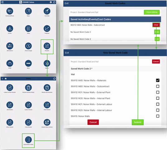 Preparing Saved Work Codes creates a list of Activities, Events, and Cost Codes for easy access when completing various forms in SYNCHRO Perform Mobile. Multiple codes can be saved for quick selection.