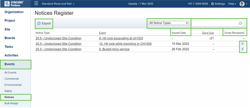 The Notices Register provides a list of all the due, created and issued notices. The rules defined in project settings for Notice Types determine which Event Types require different Notice Types.