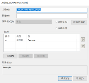 在配置块中新建变量_USTN_WORKSPACENAME变量,并赋值为Example (可结合托管的工作空间名字自定义).