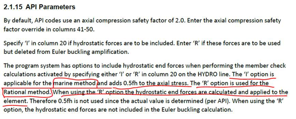 HYDRO卡第20选项I,R的具体设置方式应该如下图说明:当选择I时,杆件由于浮力产生的端部力需要通过规范推荐的0.5fh进行考虑,即这个时候浮力计算应该采用Marine 方法(该方法不涉及杆件端部力计算);当选择R 时,由浮力计算产生的杆件端部力应该被包含在杆件荷载中,即这个时候应该选择Rational 方法(该方法直接涉及杆件端部力计算)。