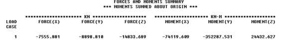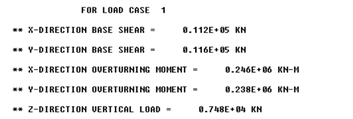 上图’FOR LOAD CASE 1’中的X,Y方向的剪力,用于与生产桩土超单元所用的荷载进行对比,当两者结果相近,认为桩土超单元比较合理;此结果并不是地震响应计算的最终结果,仅为中间结果,不能与通过加速度直接估算的基础剪力进行对比;下图’FORCES AND MOMENTS SUMMARY’中的结果才是地震响应计算的最终结果,可以用于与通过加速度直接估算的基础剪力结果进行对比。