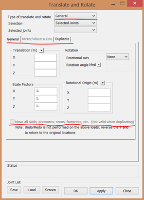 - 同时需要注意,如果移动模型的时候,要求连同平移荷载,包括skid,pressure, area, footprint等荷载,只能通过勾选‘Translate/Rotate’对话框中‘Move all skid, pressure, area, footprint, etc (Not valid when duplicating)’来实现。