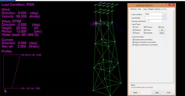通过precede打开模型文件,可以展示这种效果:DISPLAY>Labeling Options>Load, 选择一个工况,这个工况同时包含风浪流的定义,勾选所有选项,即可显示该效果。如果风浪流定义在seainp文件,导入seainp文件即可。