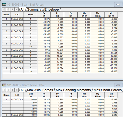 2. STAAD通常会提供两个表格用于显示杆件(梁/柱)的弯矩。第一个表格是Beam End Forces,该表格只提供了杆端力,第二个表格是Beam Force Detail,该表格提供了一个杆件的5个截面位置的内力(包括2个起始点位置)。