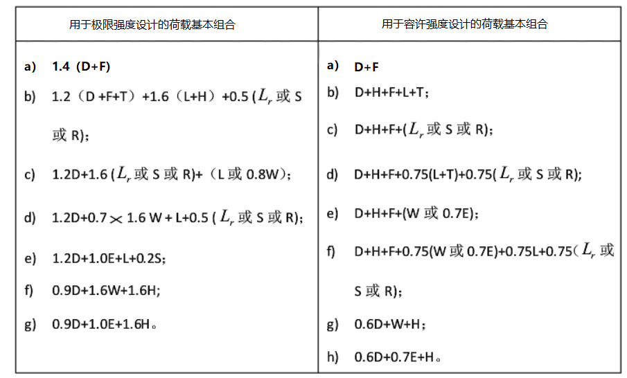美国规范中给出了两种基本荷载组合,分别是极限强度设计的荷载组合以及容许强度设计的荷载组合。这两种组合都可以用于结构强度验算,但需分别应用于不同的设计方法:荷载抗力系数设计方法(LRFD)和容许应力设计发(ASD)。上表中,给出美国的基本荷载组合的表达公式,其中D为恒荷载,L为活荷载,Lr为屋顶活荷载,S为雪荷载,R为雨水荷载,W为风荷载,E为地震荷载,F为有明确压力及高度峰值的流体荷载,H为由土地下水或大量材料产生的压力,T为自应变荷载。