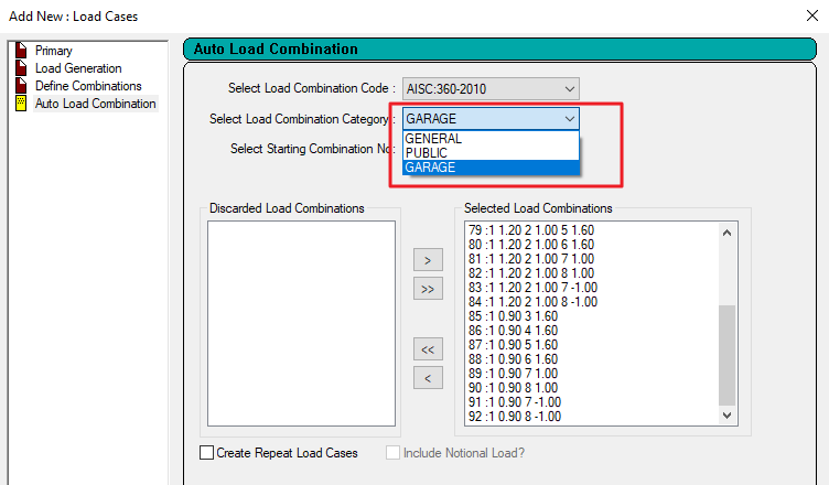 当STAAD中,选择AISC 360-2010时,在组合分类中存在有:General、 Public和Garage三个类别: