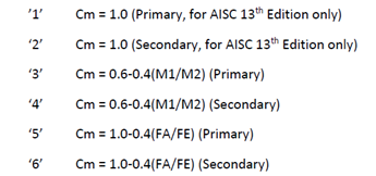 Cm系数考虑的是由于P-δ效应(假定杆件端部无横向位移)导致的弯矩放大作用。关于CM的取值在POST 3.3.5.4节中提到了杆件分类(member class):包含主次结构(primary , secondary).在AISC规范中对于屋架有主次结构杆件的分类,SACS中主次结构的分类就是其字面的意思,如果需要,需要由用户自己设定主次结构,并且SACS中的主次结构分类仅仅只是标记的作用,对计算没有影响,对计算有影响的是CM的取值。