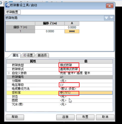2.选择一种桥架样式,并在“属性”中设置基本的参数,如电压等级、容积率;