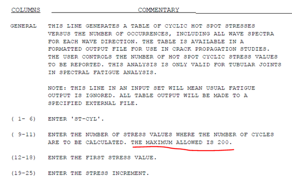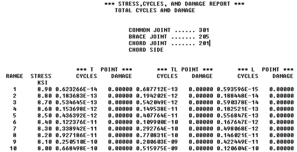 同时还需要注意,在生成的应力幅值,循环次数,和损伤报告中的应力幅值,通过测试,发现实际上是包含了SACS计算的SCF的影响的。所以如果用户要自己另外考虑SCF,需要在疲劳输入文件中设定将所有节点的SCF值考虑为1.0. (通过设定最低和最高SCF为1.0 (SCFLM,和FTOPT中第40-43列组合设定。))