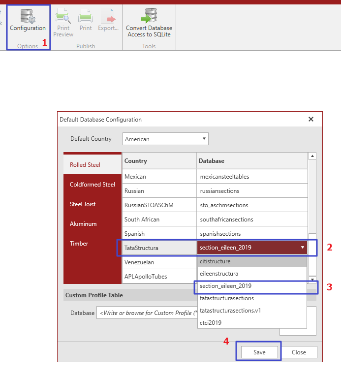 d. 然后,选择Configuration>找到TataStructura,在左侧下拉列表中,选择转换好的db3文件,然后点击Save按钮,重启后截面数据库后,TataStructura下默认的Database就设置成属于自己的截面数据库了。