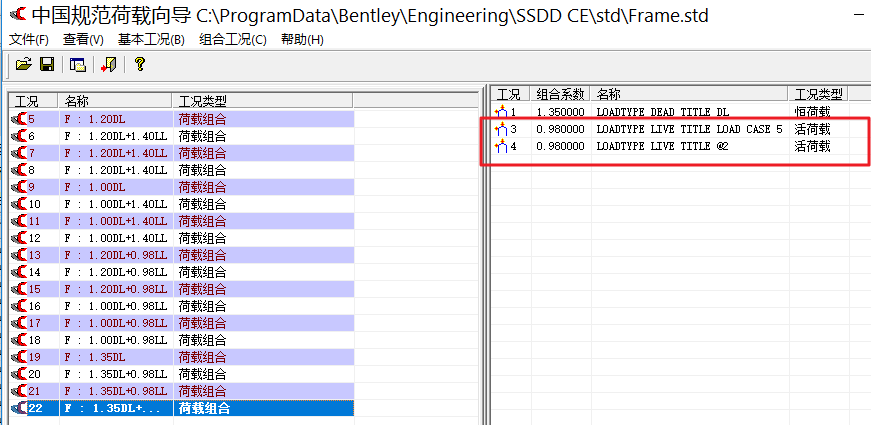 当采用自动生成内力荷载组合时候,软件生成了5-22的组合工况,其中18-22工况均是包含工况3和工况4的组合工况。