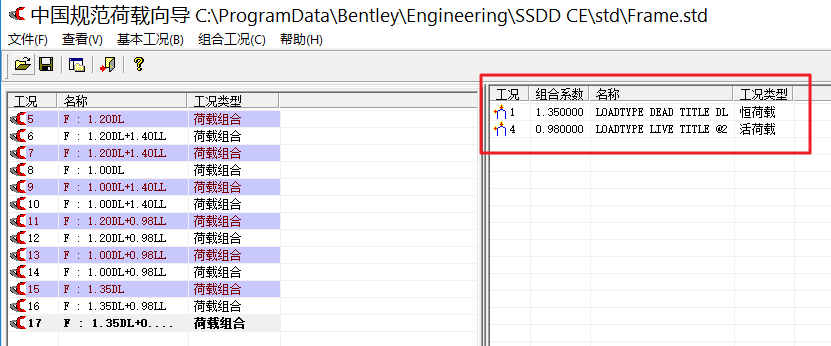 当采用自动生成内力荷载组合时候,软件生成了5-17的组合工况;