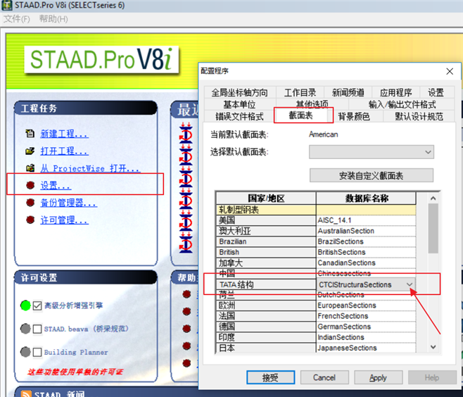 再次,启动STAAD.Pro SS6软件,进入后,找到设置,选择截面表,点击”TATA结构“类别下的箭头所指的下拉菜单,选择CTCIStructureSection文件,点击Apply,以及接受。