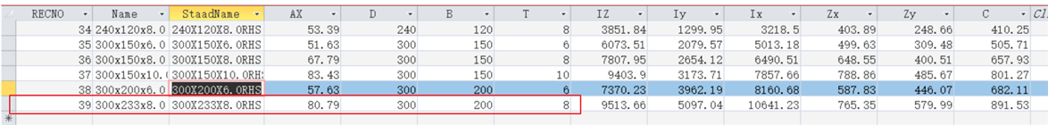 再次,例如打开RHS截面,这里面一共具有40个截面,这个截面编号不能修改,也就是说1、2、3、4到40,这些截面序号不要修改排列次序,只能在最后面增加或者减少截面个数,但其中间的内容是可以修改的。这里我们减少一个40截面,并且将39号的截面改成如下图所示(注意要将Name 和Staad Name都改掉),保存该数据库文件。