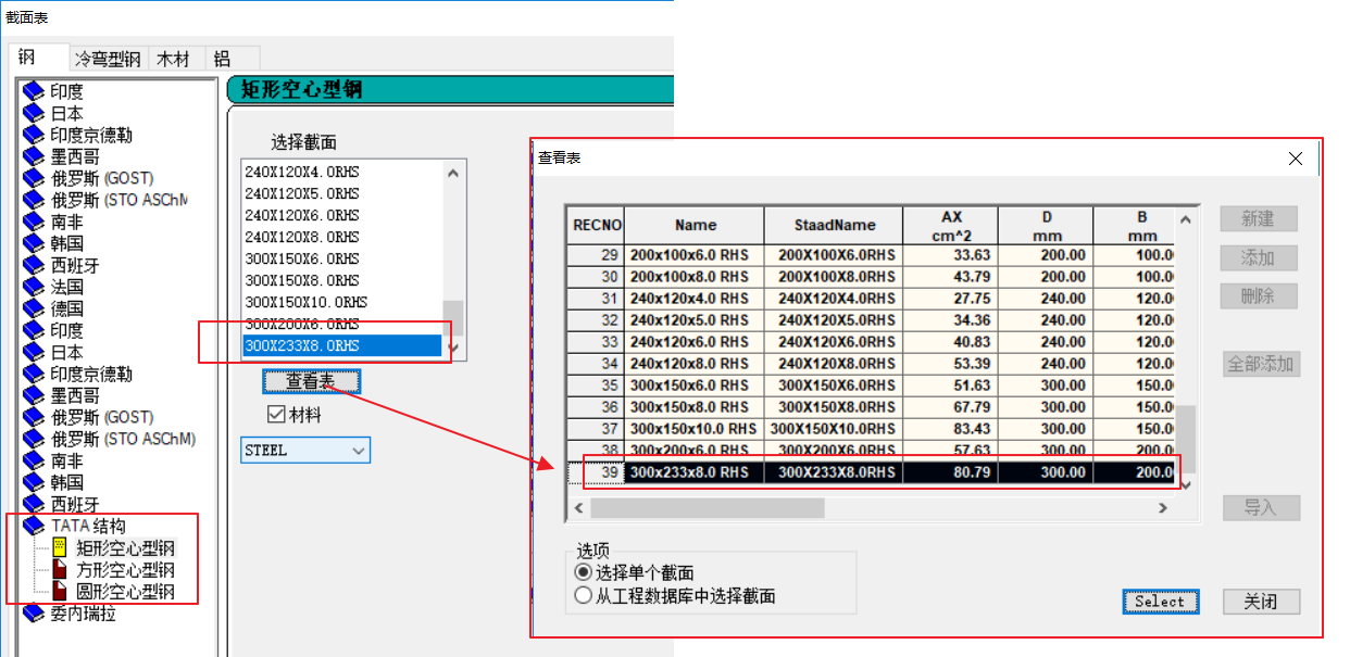 最后,新建文件,打开模型,进入:概述>属性>标准截面库:可以看到我们修改的这个300x233x8.0RHS截面。(注意:这里的x是小写字母x而不是乘号。)