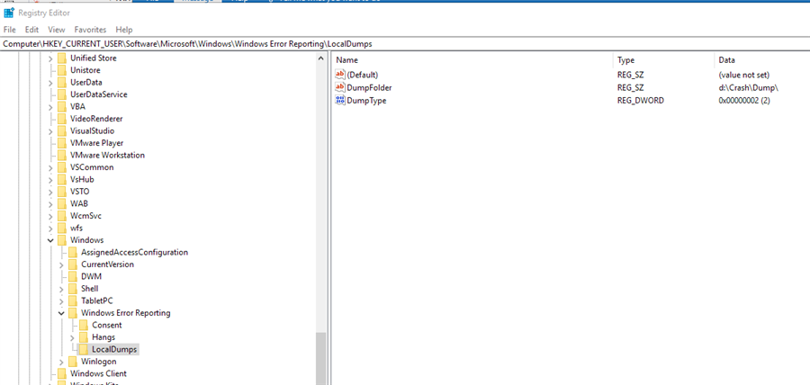 HKEY_LOCAL_MACHINE\SOFTWARE\Microsoft\Windows\Windows Error Reporting\LocalDumps