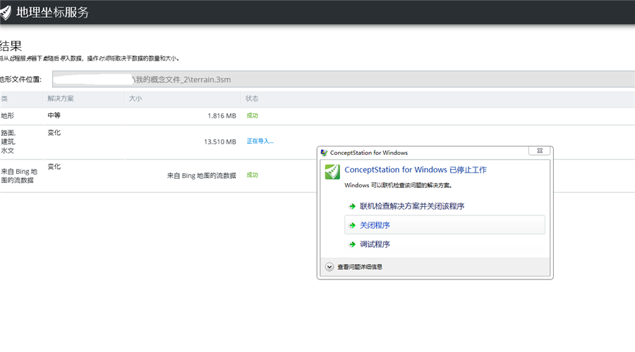用户使用ConceptStation的地理坐标服务导入既有路面,建筑及水文信息的时候会出现ConceptStation for Windows 已停止工作的报错,通常是因为所下载的OSM(Open Street Map)文件过大造成的,