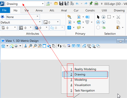 【切换工作流】可以在MicroStation截面直接敲击键盘上的 \ 符号,即可调出工作流菜单,接着输入对应的数字即可切换。如下截图: