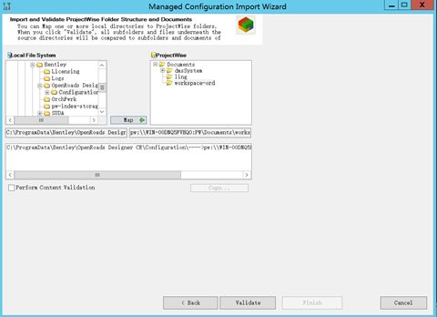 5.选择OpenRoad Designer的工作空间路径已经ProjectWise的“PSCE_Managed_Configuration”文件夹,点击“映射”,点击“验证”,如图: