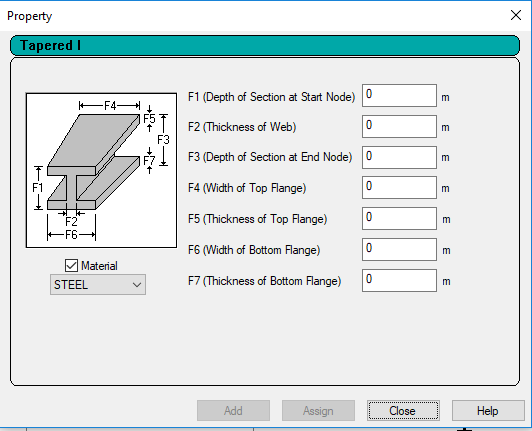用于建立标准截面库中没有列出的常见棱柱型截面和楔形截面。可对欲添加的截面类型,直接附带对应的材料属性。材料属性需提前建立,通过下来列表选择。可以建立:圆型截面、矩型截面、T型截面、梯型截面、通用截面、楔型I截面、楔型钢管。