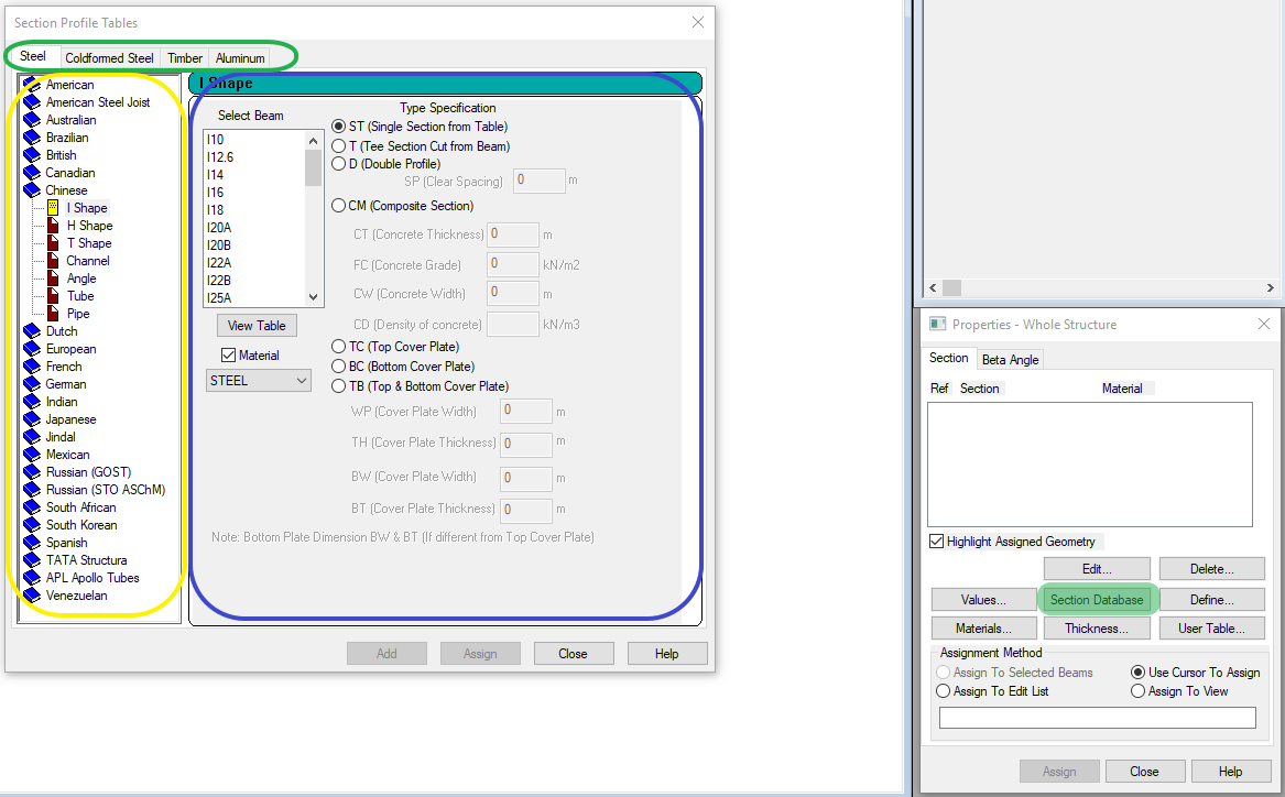 点击标准型钢库-Section Database后,弹出截面布置对话框,根据构件的材料类型,在窗口最上端选择对应的材料。材料类型分为:普通钢构件、冷弯薄壁型钢、木材、铝材。再选择构件截面所在的国家,找到对应的截面形式,如I型、H型等。