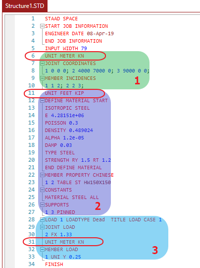 二级荷载命令-Member Load之前具有独立行命令行“UNIT Meter kN”,如蓝色块体3,则之后输入的值均将以Meter-kN进行输入,之前输入的值仍然为按Feet-kip输入值;