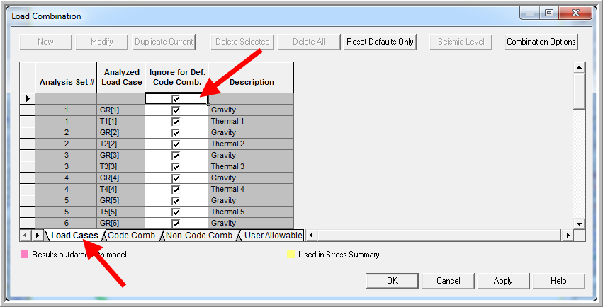 3. Confirm that "Ignore for Def. Code comb" check-boxes are all checked for all load-cases.