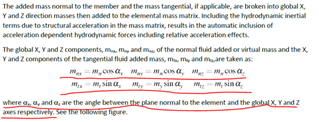 计算的基本思路为:计算杆件在X,Y,Z轴所对应平面YZ, ZX, XY内的投影长度,计算出各个轴的总的附加质量,然后根据杆件与各个轴的夹角,将总的normal added mass乘以杆件与对应轴所成夹角的正弦,即可得到最终的各个轴对应的normal added mass(即垂直于各轴的附加质量)。