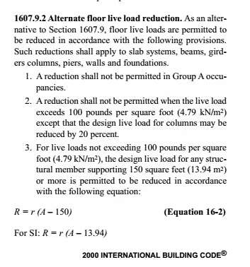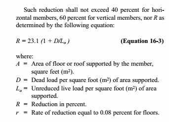 当楼板活荷载值不超过100 psf (即4.79kN/m2),且构件支撑楼板面积不小于150 sq.ft(即13.94m2),将按照公式16-2考虑楼板活荷载折减。
