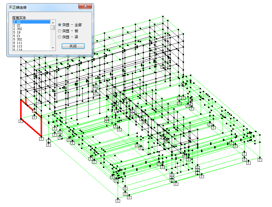 模型在加荷载及结构计算前是否必须要确保板与板连接正确(板上有且只有板的四个角点与其他部件相连)及梁与板正确连接(梁的节点只能与板的四个角点之一相连)?如下图,软件在检查时提示错误:
