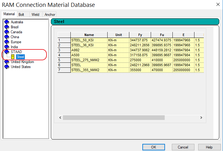 6.检查材料性质。点击红框3中的图标,该命令中将包含节点连接设计所需要的所有材料性质;Ram Connection会自动继承STAAD.Pro中设置的材料属性,在Ram Connection模块中无法编辑STAAD.Pro中设置的材料属性,若继承出现错误,需要回到分析模块中重新设置并指定后,计算后,再回到Ram Connection模块中。