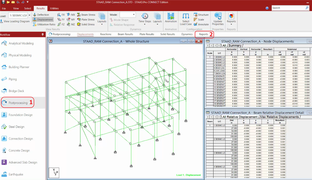 2. 自定义包含节点结果的模型计算书——当模型中包含的节点均完成了节点设计后,进入Postprocessing-后处理模块,选择Result Setup中的工况,点击Reports选项卡,如下图所示: