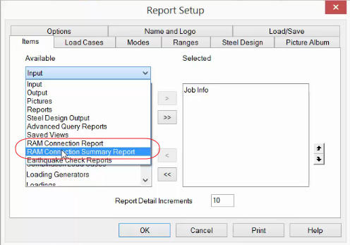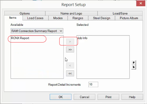 这里采用Summary Report-简易报告,选中RCNX Report,加入Selected窗口中,点击OK,即可得到Ram Connection的计算报告。