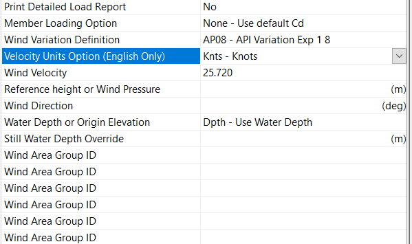 在SACS 中,风速输入的单位可以选择公制单位与英制单位两种。如果选择公制单位,则风速固定为m/s。如果选择英制单位,则可以选择为knots,ft/s或者mile/hour其中的一种,英制单位时风速单位种类通过如下选项控制,