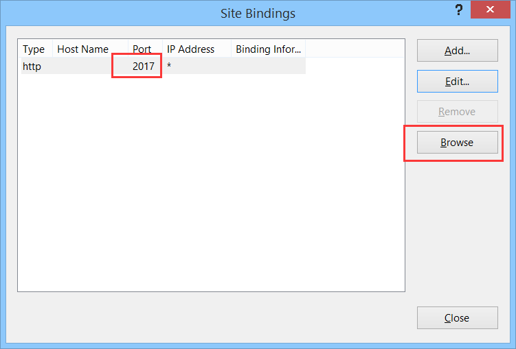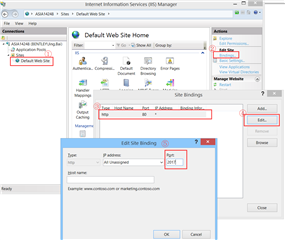 展开左侧的Site> Default Web Site,选中Default Web Site后,点击右侧Edit Site下的Bingdings打开Site Bindings窗口,选中第一行后点击Edit按钮,打开Edit Site Binding窗口,在Port栏中将80改成2017,点击OK返回。