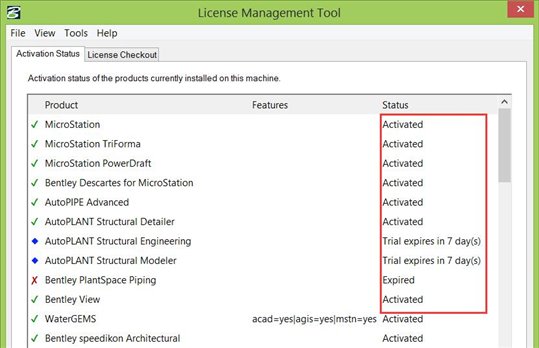 当您选择菜单Utilities > License Management...后能打开一个管理Bentley软件授权的界面如下: