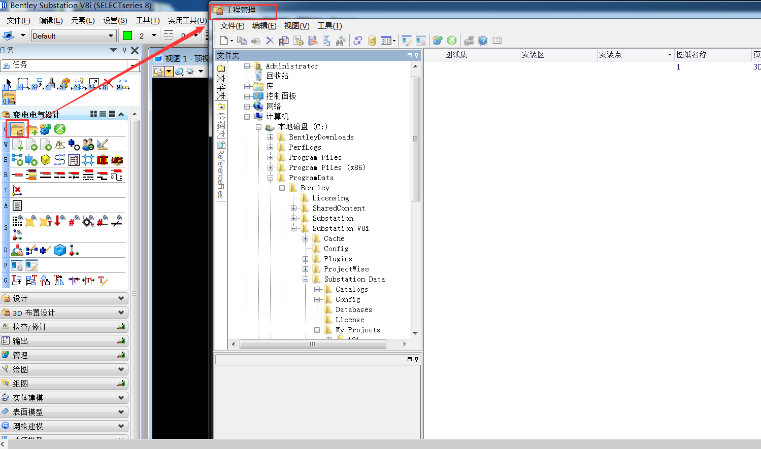 管理员权限打开Substation,系统会自动新建数据库。创建完成后,进入substation界面,在变电电气设计中,打开工程管理器。
