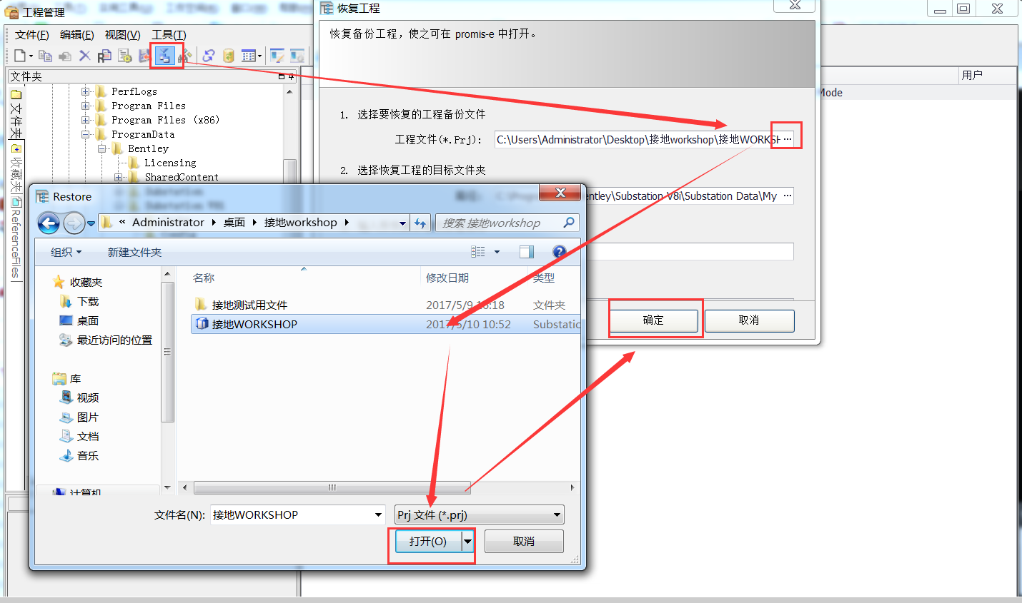 点击恢复按钮,选择资料文件夹中已备份的工程,选择确定恢复。