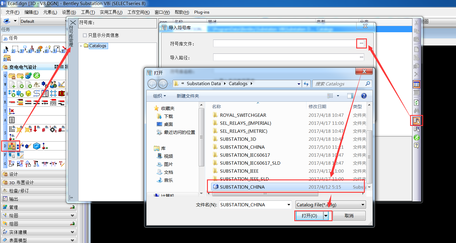 变电电气设计中选择符号库管理器,选择导入符号库,导入符号文件路径为C:\ProgramData\Bentley\Substation V8i\Substation Data\Catalogs\SUBSTATION_CHINA,导入路径默认为C:\ProgramData\Bentley\Substation V8i\Substation Data\Catalogs,点击确定导入。