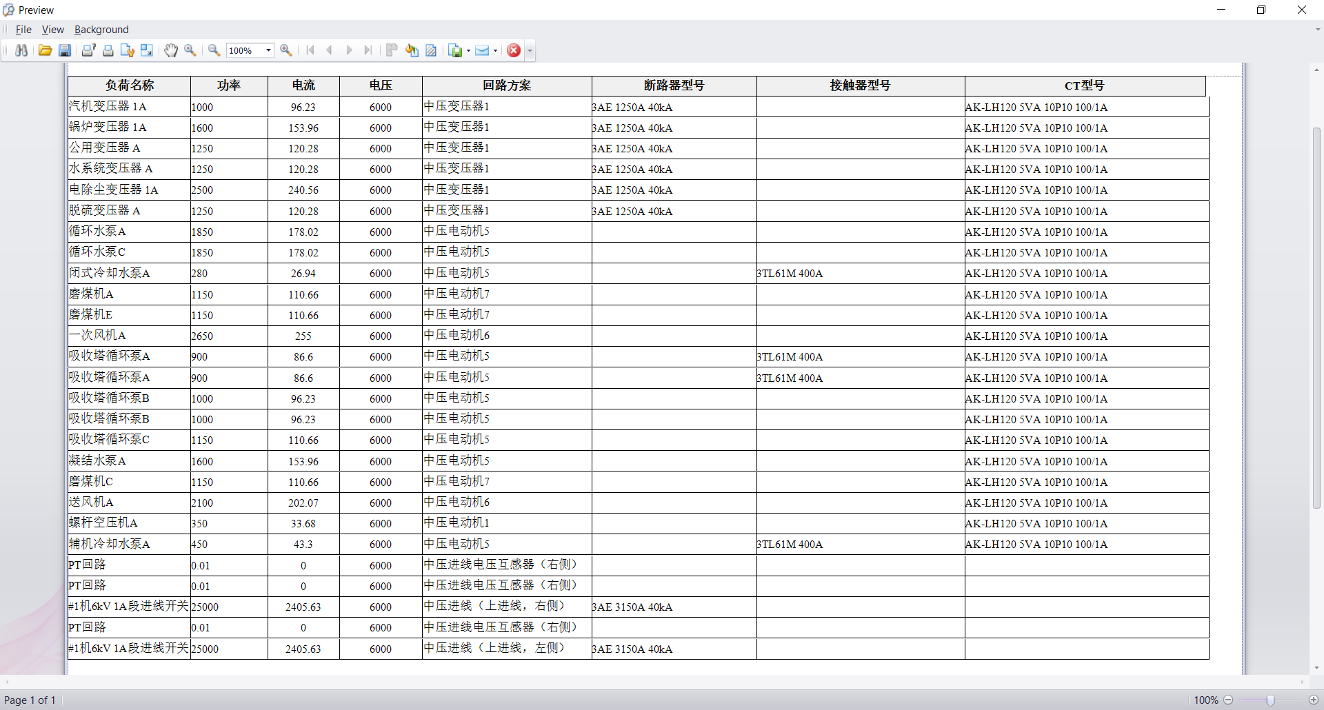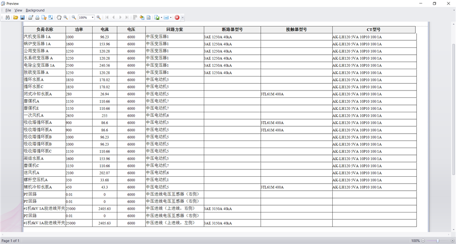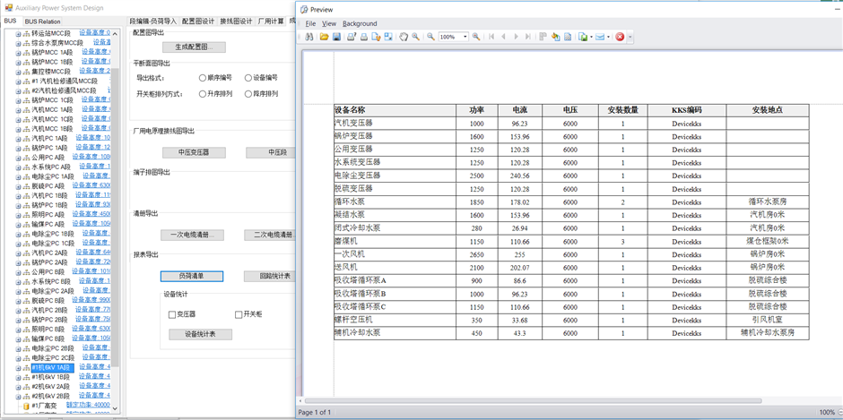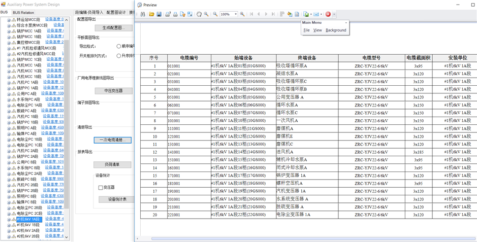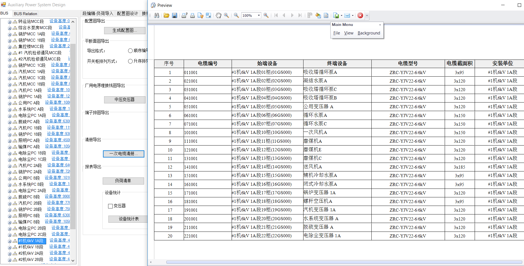 生成一次电缆清册需切换图纸至该段配置图。如选中#1机6Kv 1A段,切换图纸至#1机6Kv 1A段配置图中,点击一次电缆清册,则该报表为#1机6Kv 1A段下所有电缆统计。