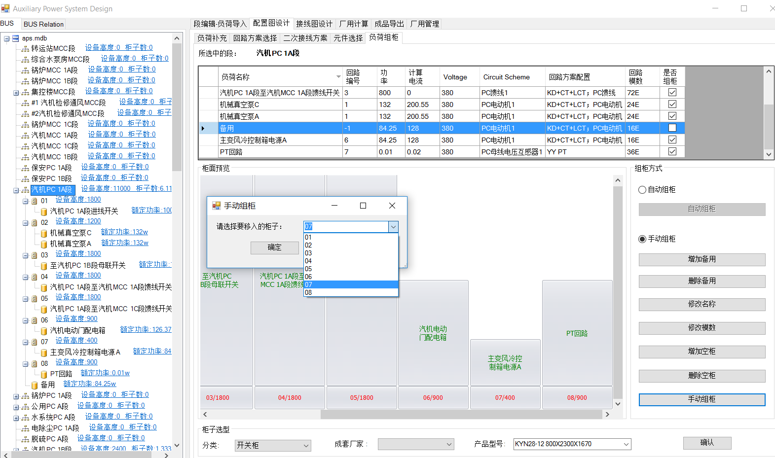 选中备用负荷,选择“手动组柜”,下拉框中选择该备用要放置的柜子,点击确定。