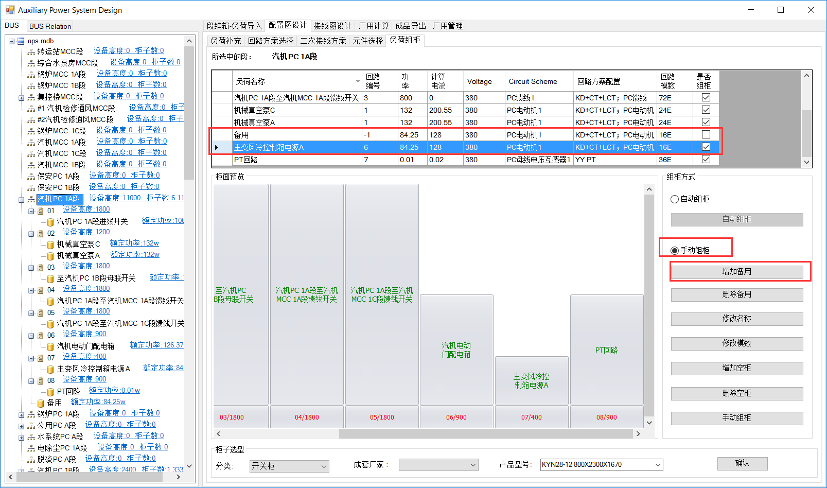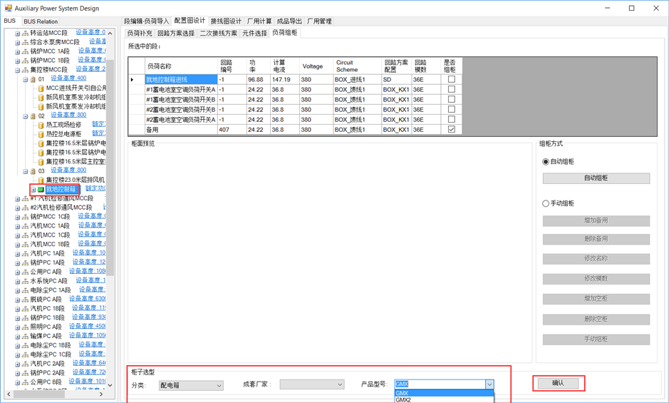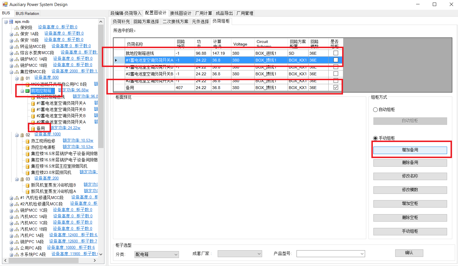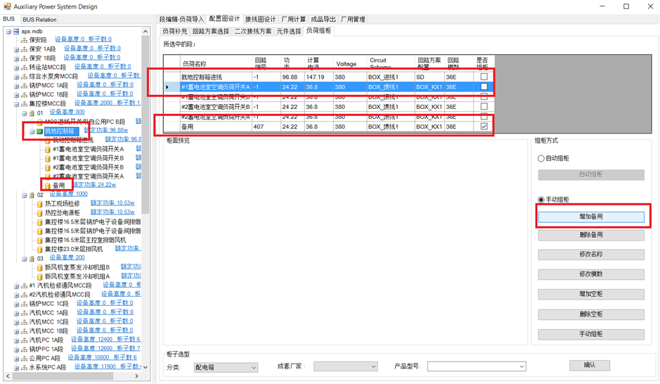 MCC段组柜与PC段一致。就地控制箱内设备不自动组柜,可在配电箱内增加备用。选中就地控制箱,负荷列表中选择要备用的负荷,点击增加备用。备用负荷列至负荷列表与左侧树图中。