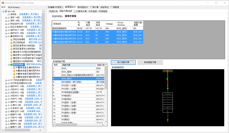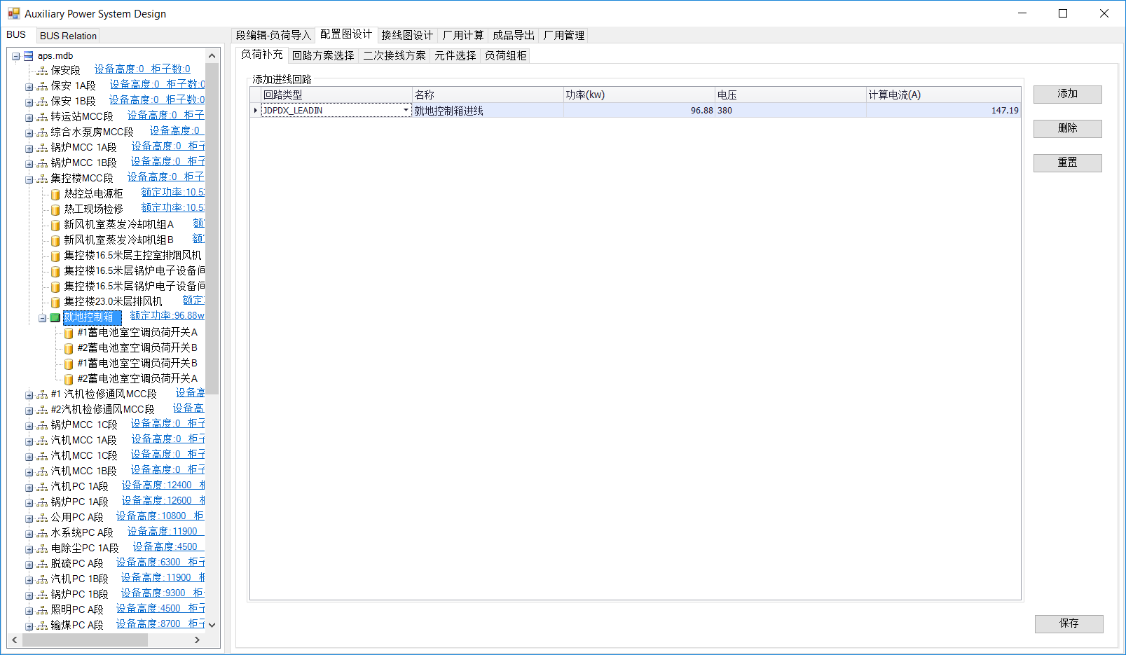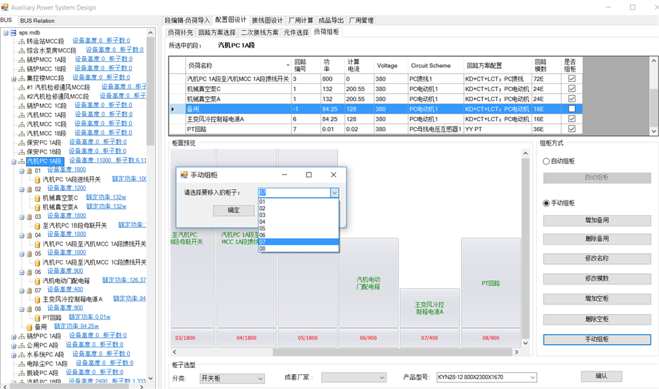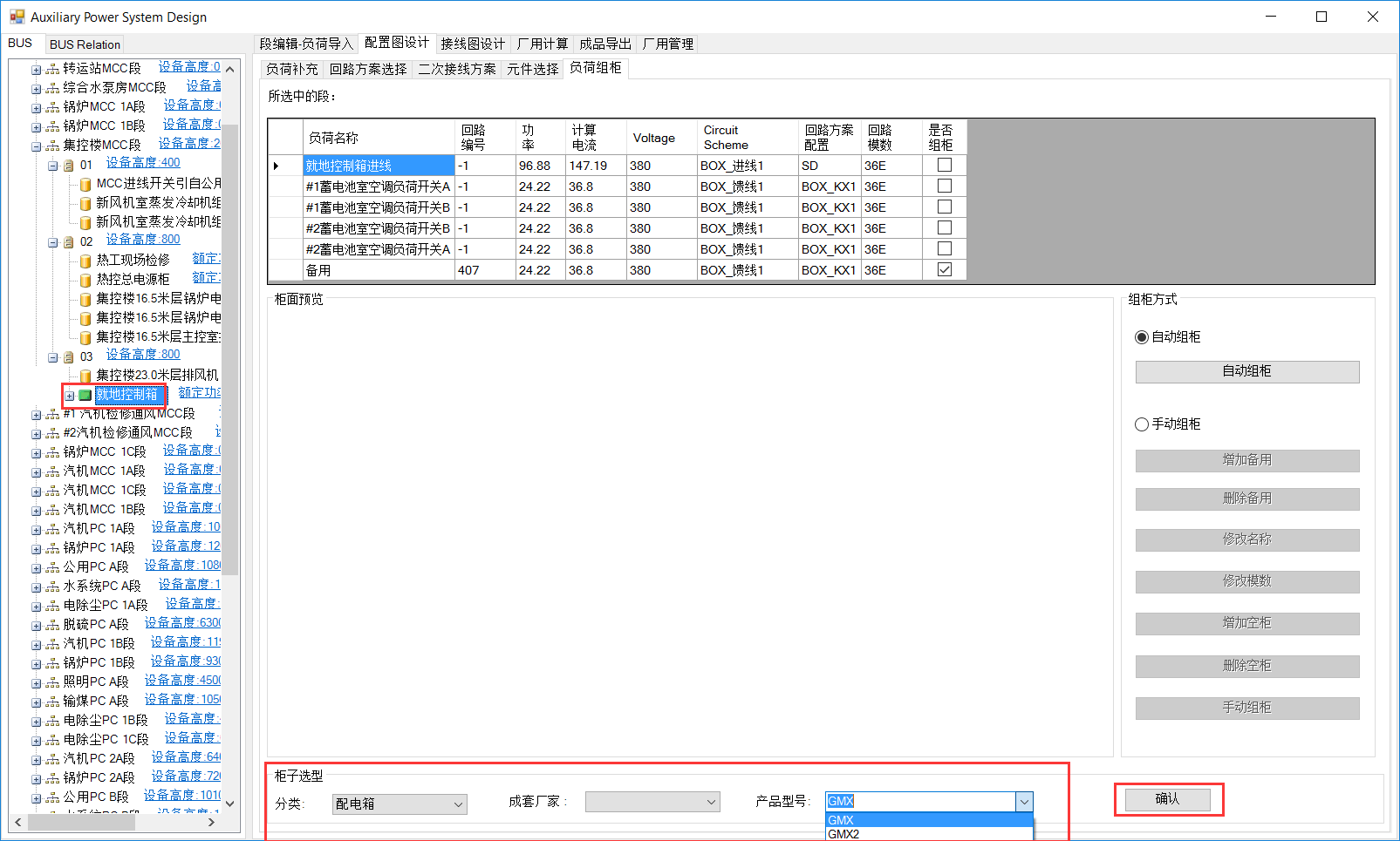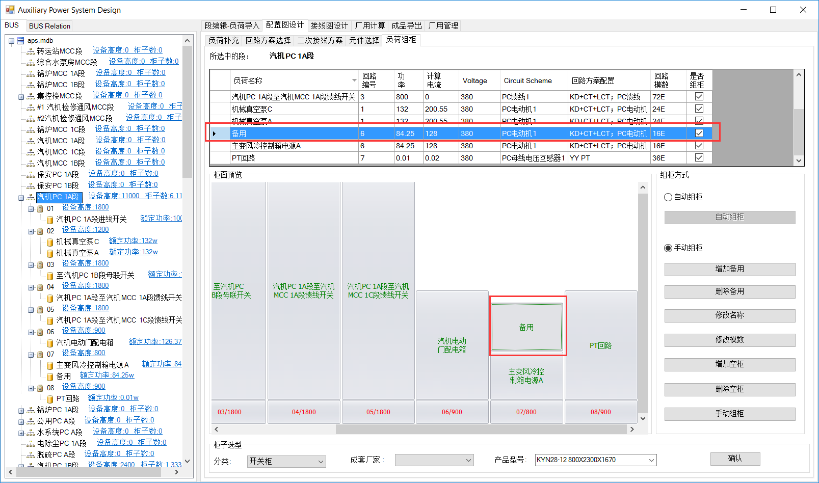 MCC段组柜与PC段一致。就地控制箱内设备不自动组柜,可在配电箱内增加备用。选中就地控制箱,负荷列表中选择要备用的负荷,点击增加备用。备用负荷列至负荷列表与左侧树图中。