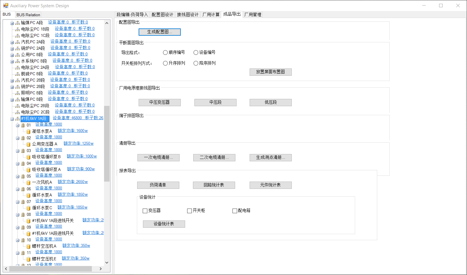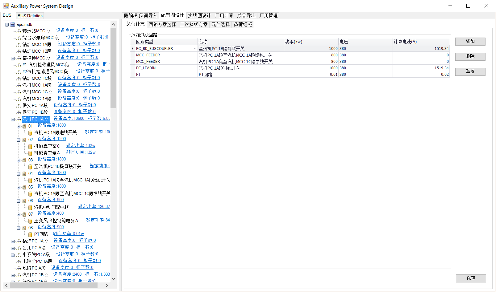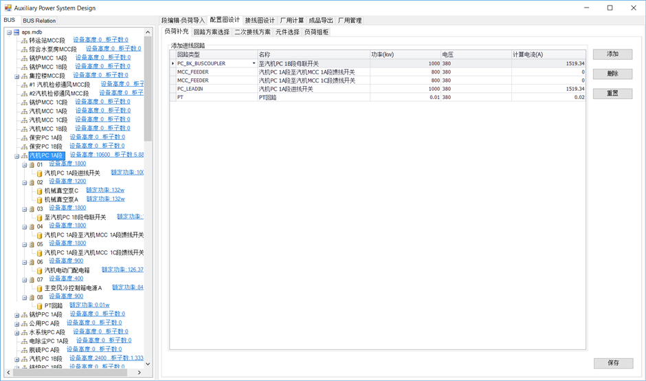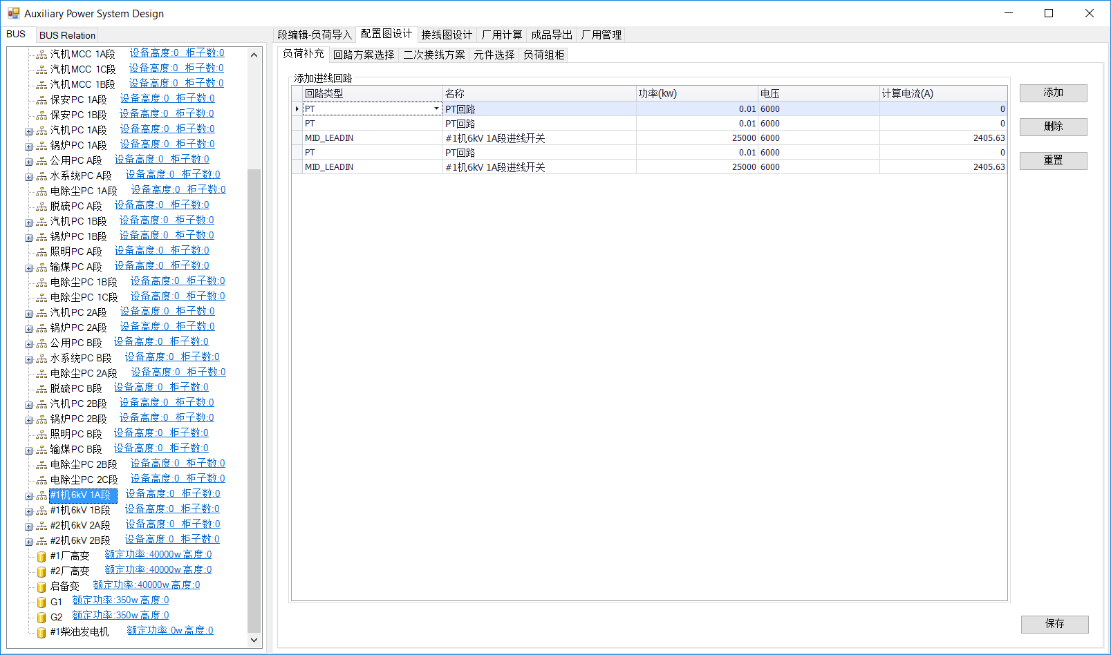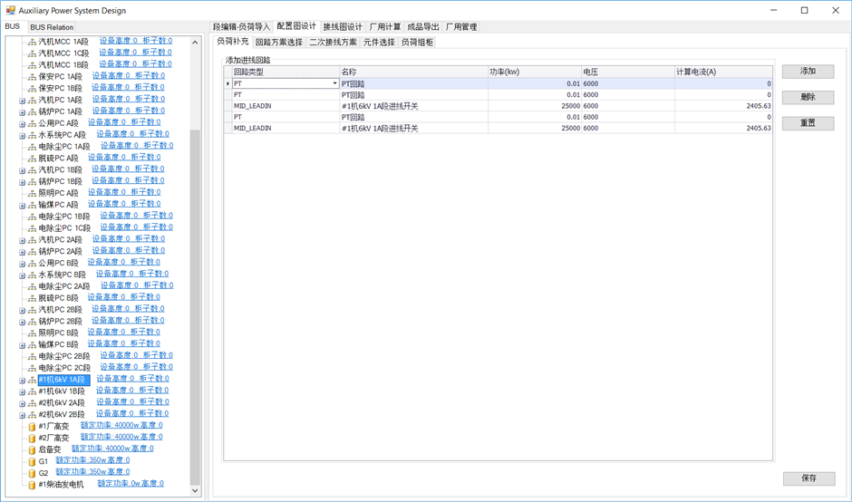 选中“负荷补充”。在BUS中选中中压段如#1机6Kv 1A段,系统根据已建的段连接关系,自动添加相应的回路类型如下图,点击保存。