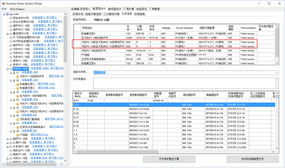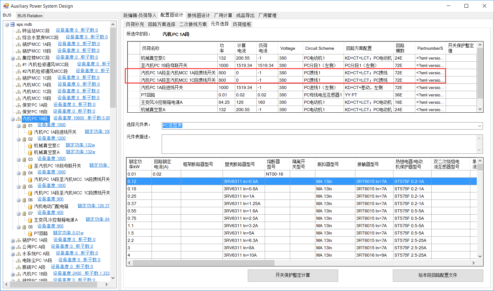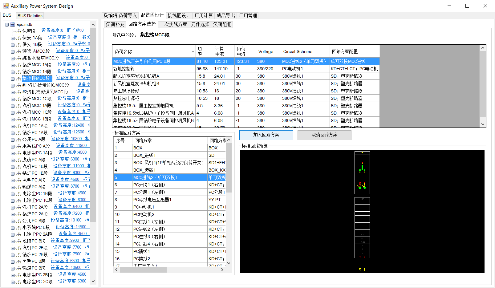 该操作为PC段一致,区别在于各负荷选择的回路方案不同。选中集控楼MCC段,分别选择回路方案。