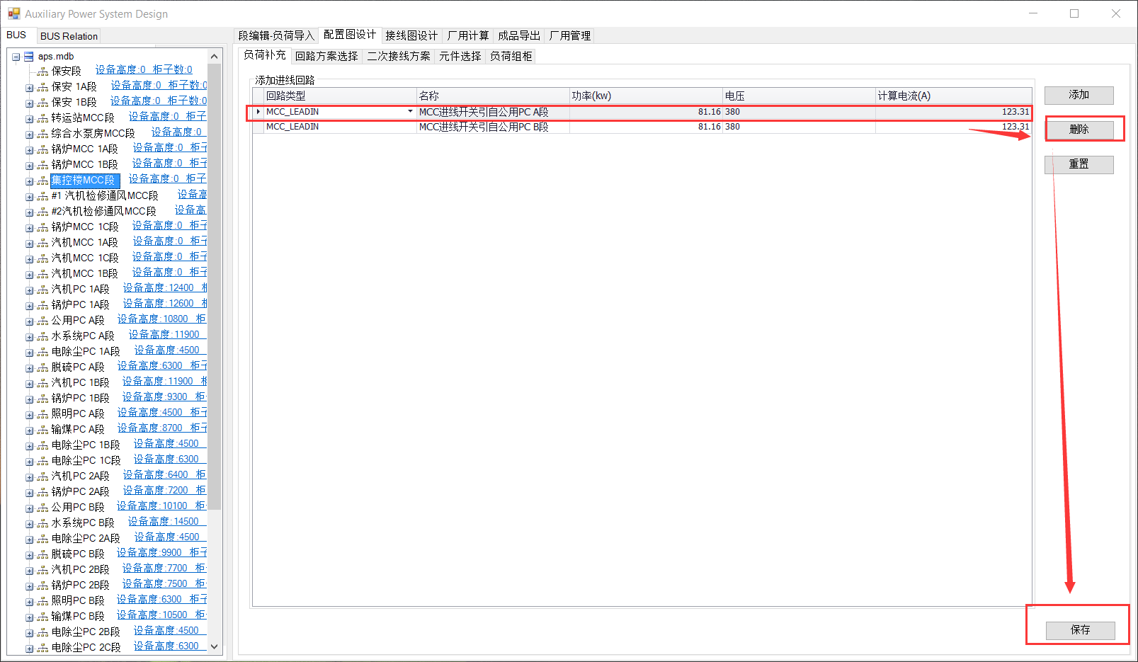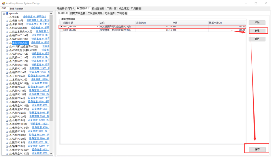 以集控楼MCC段为例,该MCC段涉及双电源进线和配电箱。在双电源进线的MCC段负荷补充时,可手动删除其中一个回路。选中要删除的进线回路,点击删除后点击保存,则该回路被删除。