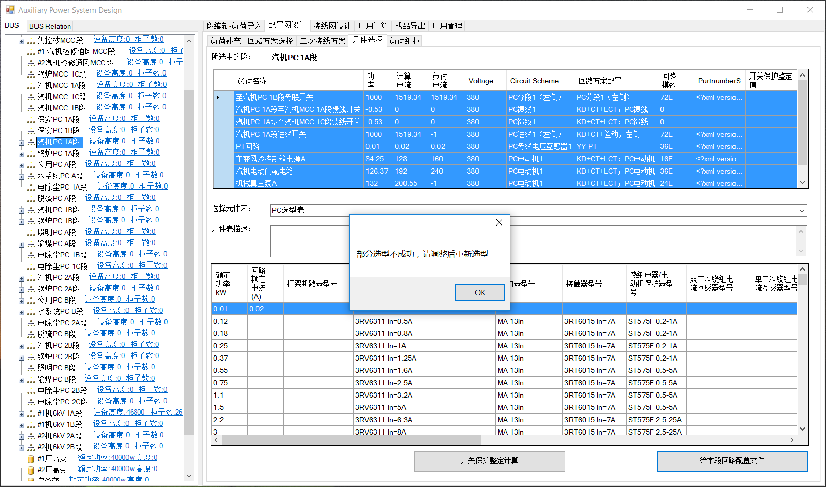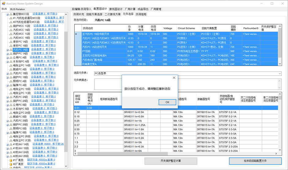 选型有错误时,提示“部分选型不成功,请调整后重新选型”。一般是由于功率值未正确填写,该界面可手动修改功率和电流值,调整后重新选型即可。