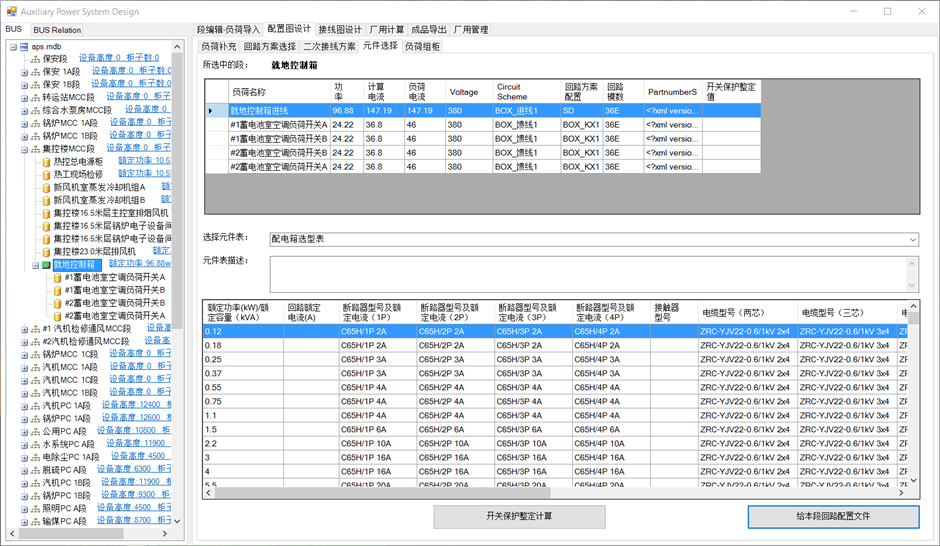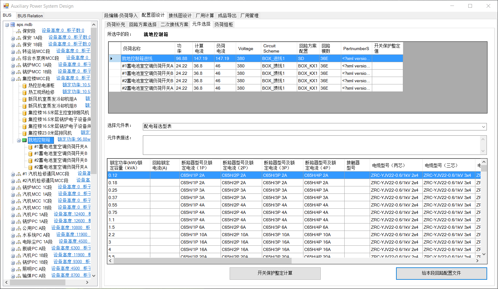 选中就地控制箱,选择元件表下拉框中选择“配电箱选型表”。可全选后点击给本段配置回路。