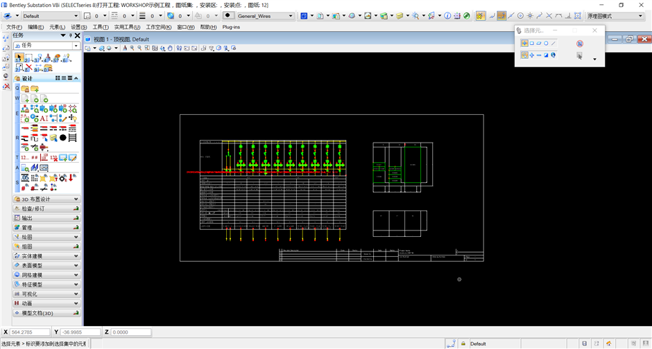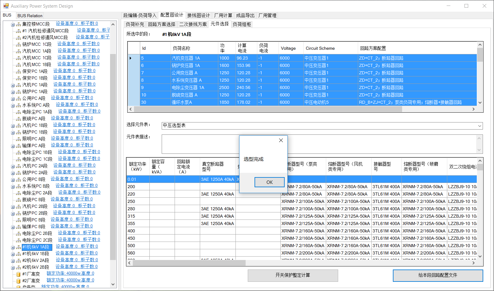 切换至“元件选择”界面,界面中列出该段下所有负荷基本信息与回路方案配置信息。选中(可多选、单击列表左上角可全选)要选型的负荷,在选择元件表下拉框中选择“中压选型表”。点击“给本段回路配置文件”。